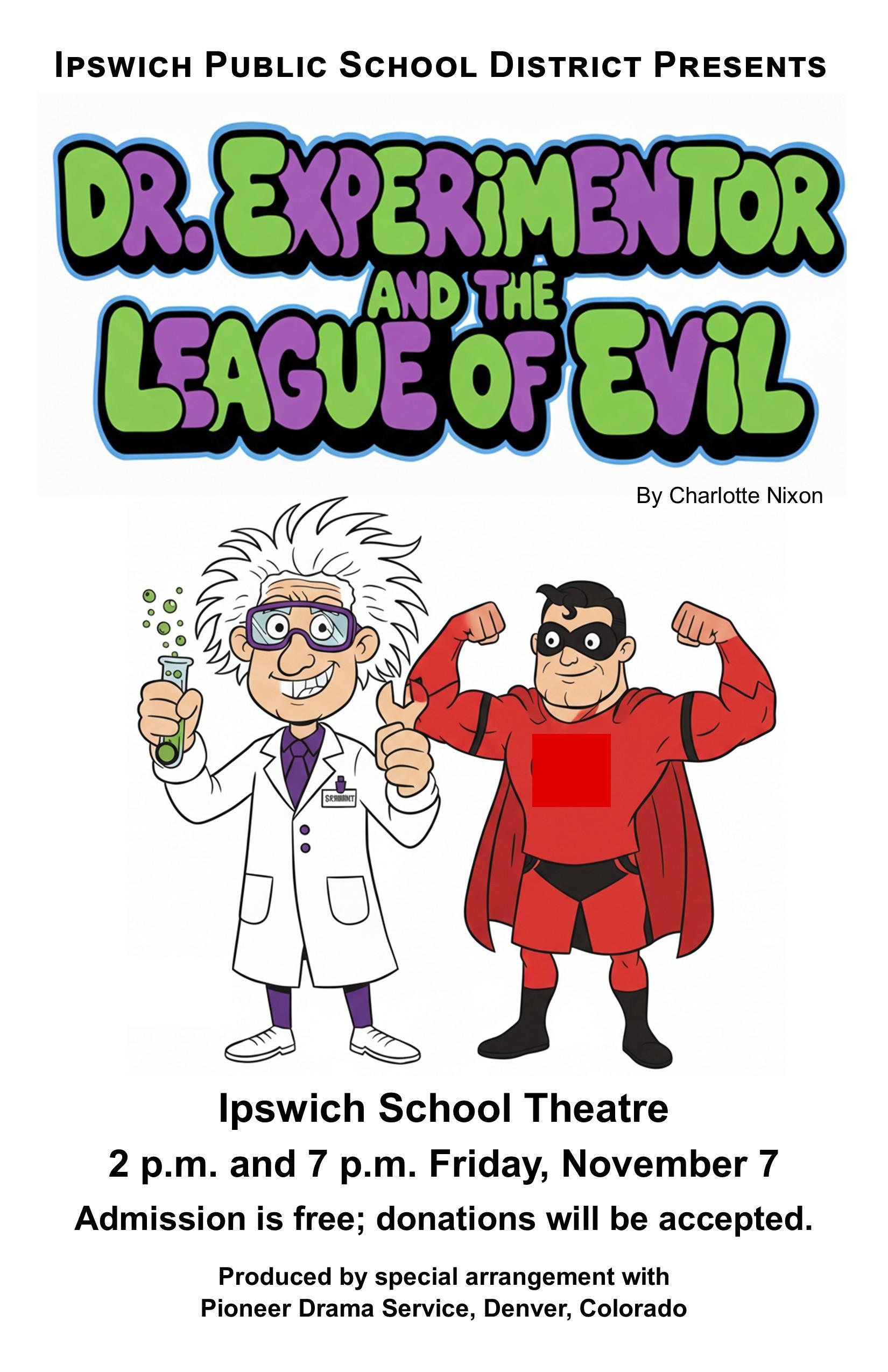 Ipswich Public School District presents Dr. Experimentor and the League of Evil by Charlotte Nixon, produced by special arrangement with Pioneer Drama Service, Denver, Colorado. Starring elementary, middle, and high school students, the play centers around Dr. Experimentor, a supervillain, who must fight to maintain his membership in the League of Evil. The problem is: to keep his membership, he must defeat superhero Extremo, who is his best friend. Meanwhile, Agnes and Abigail Anarchy and Madame Mayhem continue to pressure Dr. Experimentor to get the job done, and Dr. Experimentor's inventions minions, zombies, ninjas, and robots go awry.
